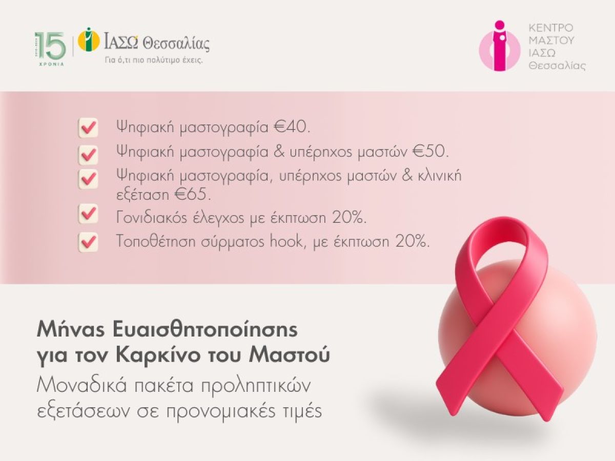 Παράλληλα, το ΙΑΣΩ Θεσσαλίας συμμετέχει ενεργά στο Εθνικό Πρόγραμμα Πρόληψης για τον Καρκίνο του Μαστού “Φώφη Γεννηματά”, παρέχοντας δωρεάν ψηφιακές μαστογραφίες σε γυναίκες ηλικίας 45 έως 74 ετών.